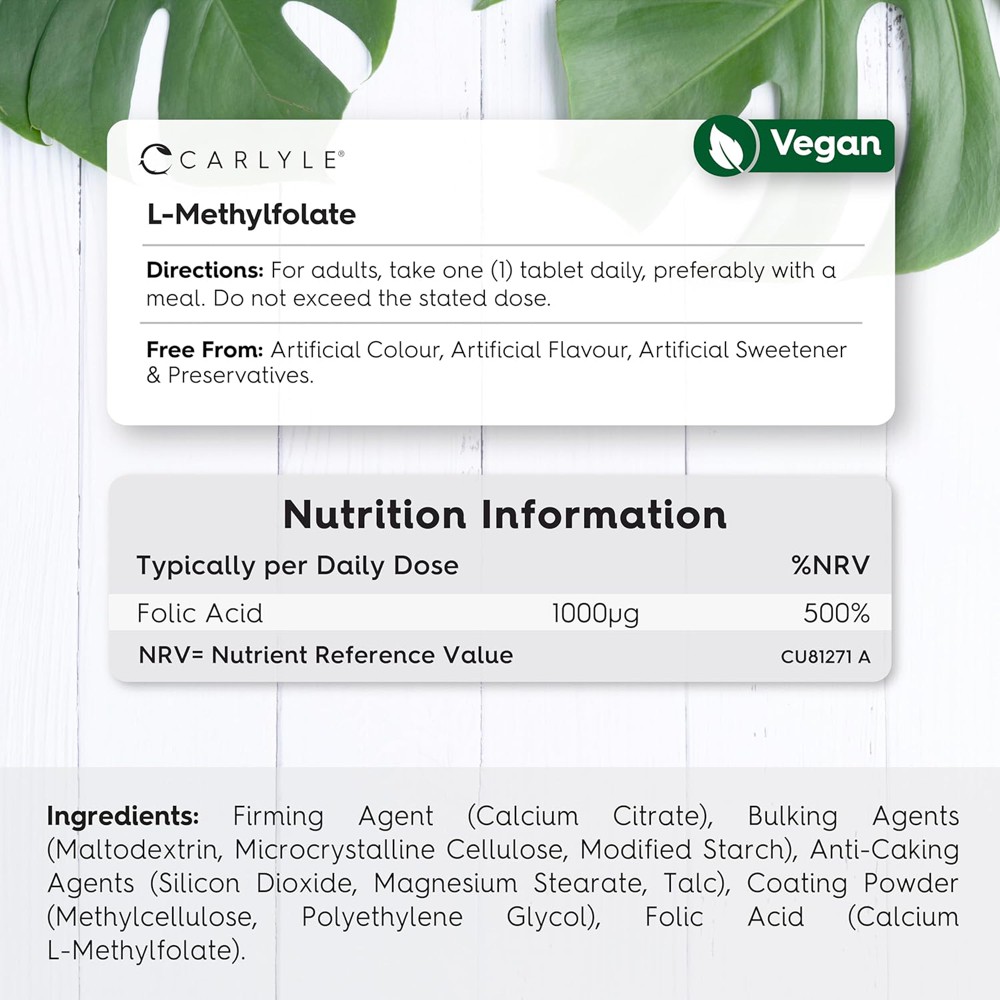 Each tablet contains 1000mcg (1mg) of folate as calcium L-methylfolate. The vegan formula uses plant-based ingredients and avoids animal-derived components.