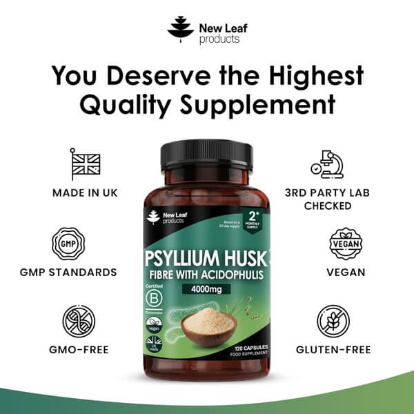 Take two capsules daily with a full glass of water, preferably with meals. Sufficient water intake is essential when taking Psyllium Husk supplements.