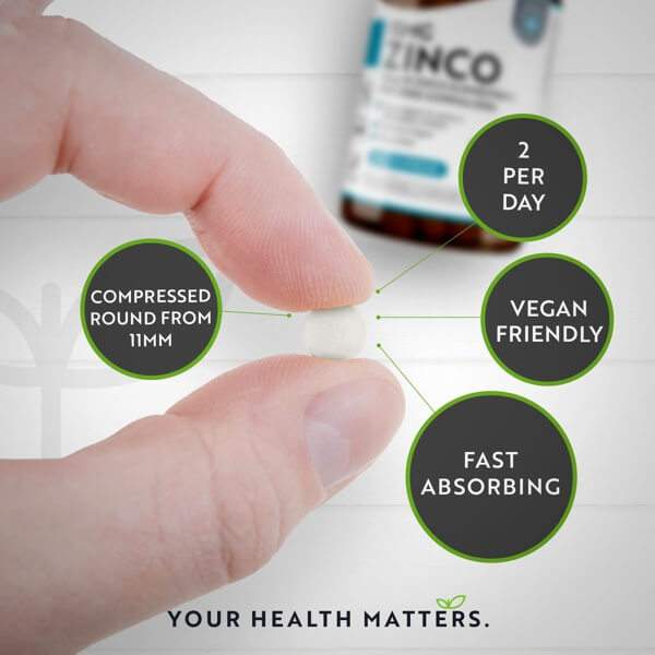 Zinc Gluconate, Dicalcium Phosphate, Calcium Carbonate, Microcrystalline Cellulose, Anti-Caking Agents (Fatty Acids, Magnesium Salts of Fatty Acids, Silicon Dioxide), Glazing Agents (HydroxyPropylMethylCellulose, Glycerin, Carnauba Wax).