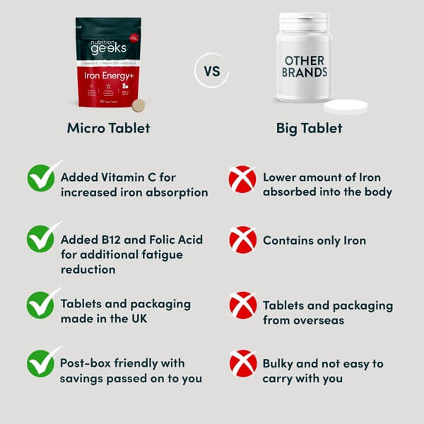 We have uniquely formulated our Iron Energy+ tablets to be just 10mm in diameter, making them easy to swallow. Despite their smaller size, Nutrition Geeks’ Iron Energy+ tablets offer optimal strength and quality. They serve as a great addition or alternative to gentle iron tablets, liquid iron supplements, active iron, iron pills, ferrous sulfate, and iron gummies.