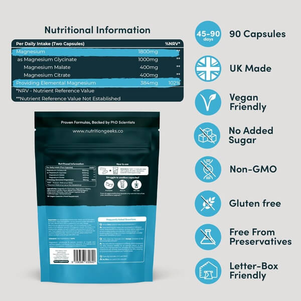 Firstly, experience superior health benefits and bioavailability with our triple magnesium complex. Each serving provides 1800mg of magnesium compounds, including 1000mg of Magnesium Glycinate, 400mg of Magnesium Malate, and 400mg of Magnesium Citrate. Consequently, this delivers 384mg of elemental magnesium, which is 102% of the Nutrient Reference Value (NRV). Moreover, each pack contains 90 vegan capsules, with a recommended serving of two capsules per day.