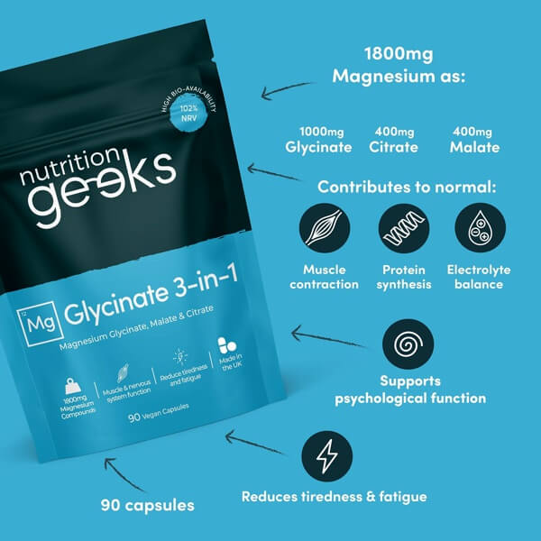 Magnesium Glycinate 3-in-1: A science-backed formula with 1800mg of magnesium as Magnesium Glyc., Magnesium Malate, and Magnesium Citrate.