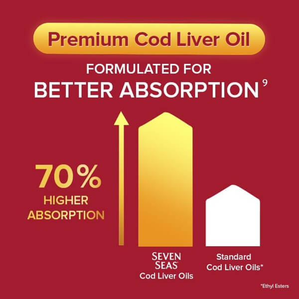 Seven Seas Cod Liver Oil with Omega-3 is a high-quality daily supplement, combining Cod Liver Oil, Fish Oil, and essential vitamins A and D. Each one-a-day capsule provides a reliable source of Omega-3 fatty acids, including EPA and DHA – nutrients known to support heart function, brain activity, vision, and a healthy immune system.
