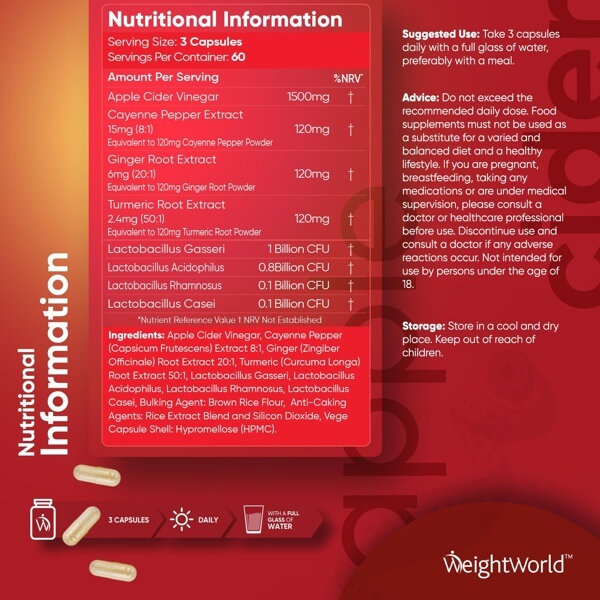 Apple Cider Vinegar, Cayenne Pepper (Capsicum Frutescens) Extract 8:1, Ginger (Zingiber Officinale) Root Extract 20:1, Turmeric (Curcuma Longa) Root Extract 50:1, Lactobacillus Gasseri, Lactobacillus Acidophilus, Lactobacillus Rhamnosus, Lactobacillus Casei, Bulking Agent: Brown Rice Flour, Anti-Caking Agents: Rice Extract Blend and Silicon Dioxide, Vegetable Capsule Shell: Hypromellose (HPMC).