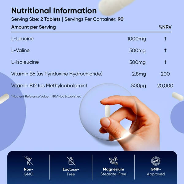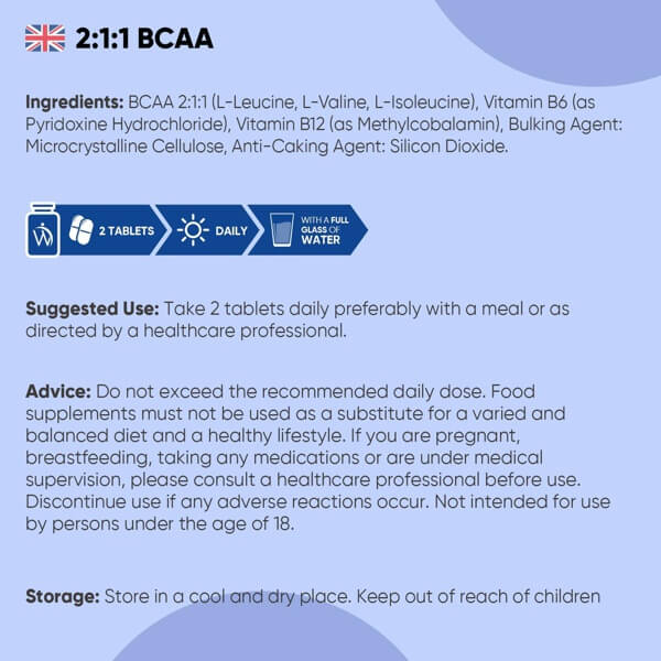 BCAA 2:1:1 (L-Leucine, L-Valine, L-Isoleucine), Vitamin B6 (as Pyridoxine Hydrochloride), Vitamin B12 (as Methylcobalamin), Bulking Agent: Microcrystalline Cellulose, Anti-Caking Agent: Silicon Dioxide.