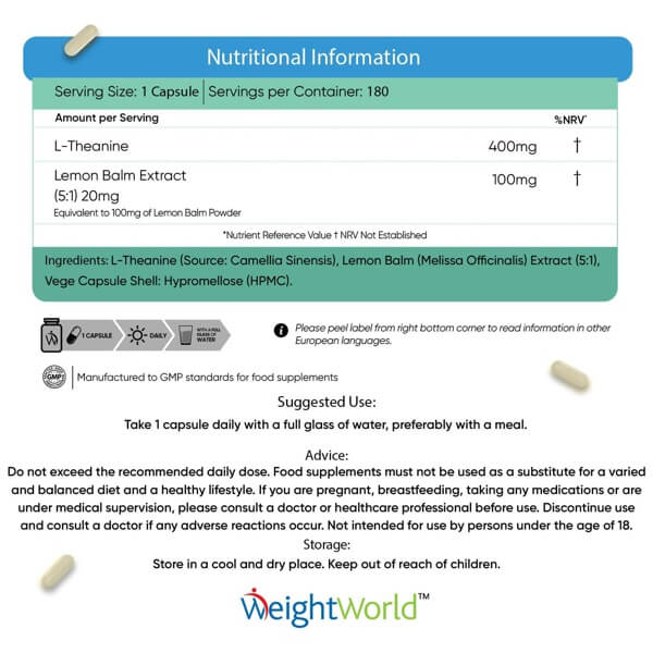 Our premium L-Theanine with Lemon Balm formula delivers 500mg of natural nootropic power in each vegan capsule. Every bottle contains 180 capsules, providing a generous 6-month supply of this powerful amino acid supplement. Unlike tablets, our capsules are expertly formulated for superior bioavailability and gentle digestion.