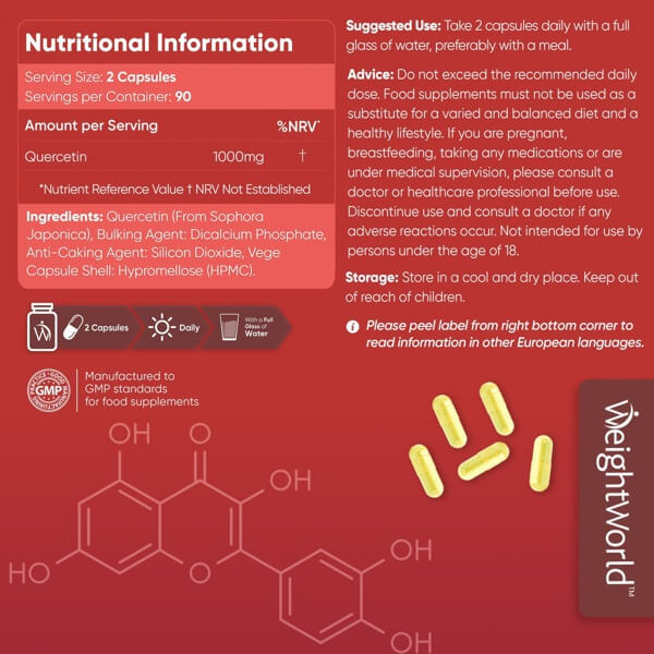 Quercetin (From Sophora Japonica), Bulking Agent: Dicalcium Phosphate, Anti-Caking Agent: Silicon Dioxide, Vegetable Capsule Shell: Hypromellose (HPMC).